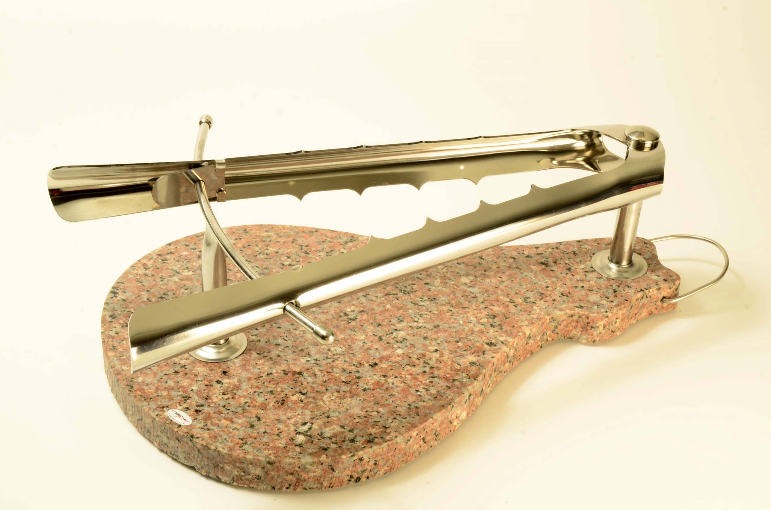 - Podstavek: iz poliranega rdečega granita v obliki pršuta – debeline 30 mm. Ta mu daje težo in s tem togost ter stabilnost med rezanjem.